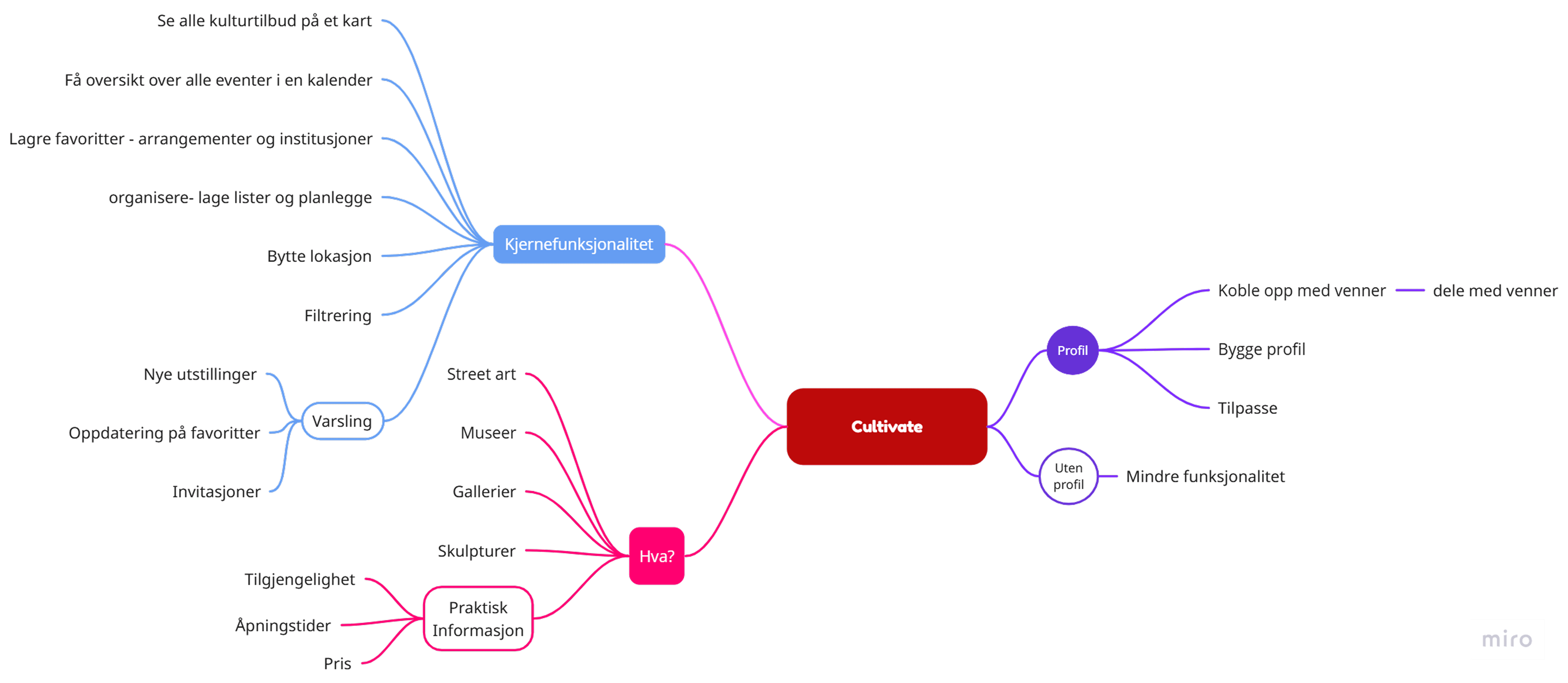 For å strukturere og bearbeide innsikten på en systematisk måte, benyttet vi tankekart som verktøy. Dette ga oss et visuelt overblikk over behov og funksjoner, og bidro til å identifisere sammenhenger, prioritere innhold og avgrense løsningens omfang.