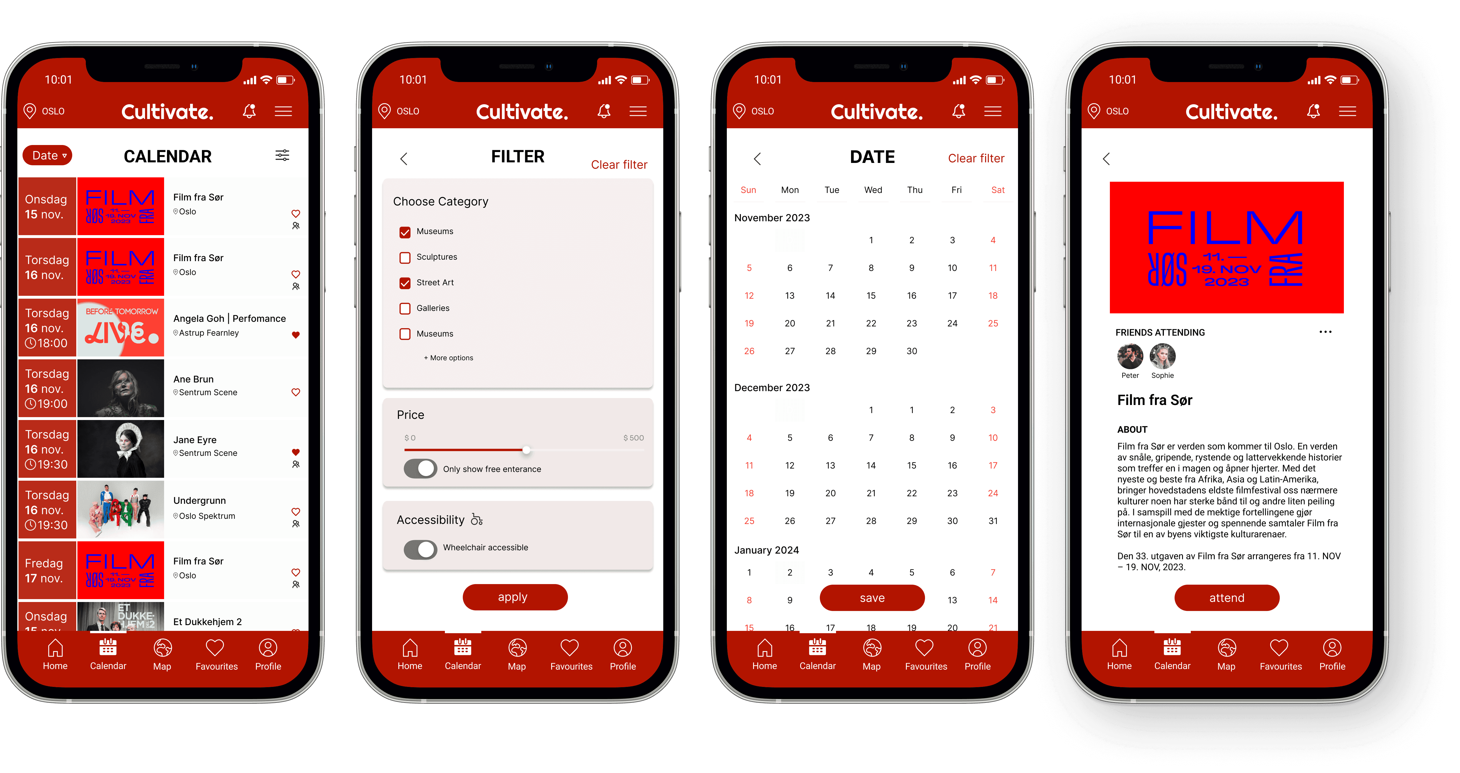 En oversiktlig kalender med arrangementer i valgt by. Filtrer på dato, kategori, pris eller tilgjengelighet, og se hvem av vennene dine som planlegger å delta.