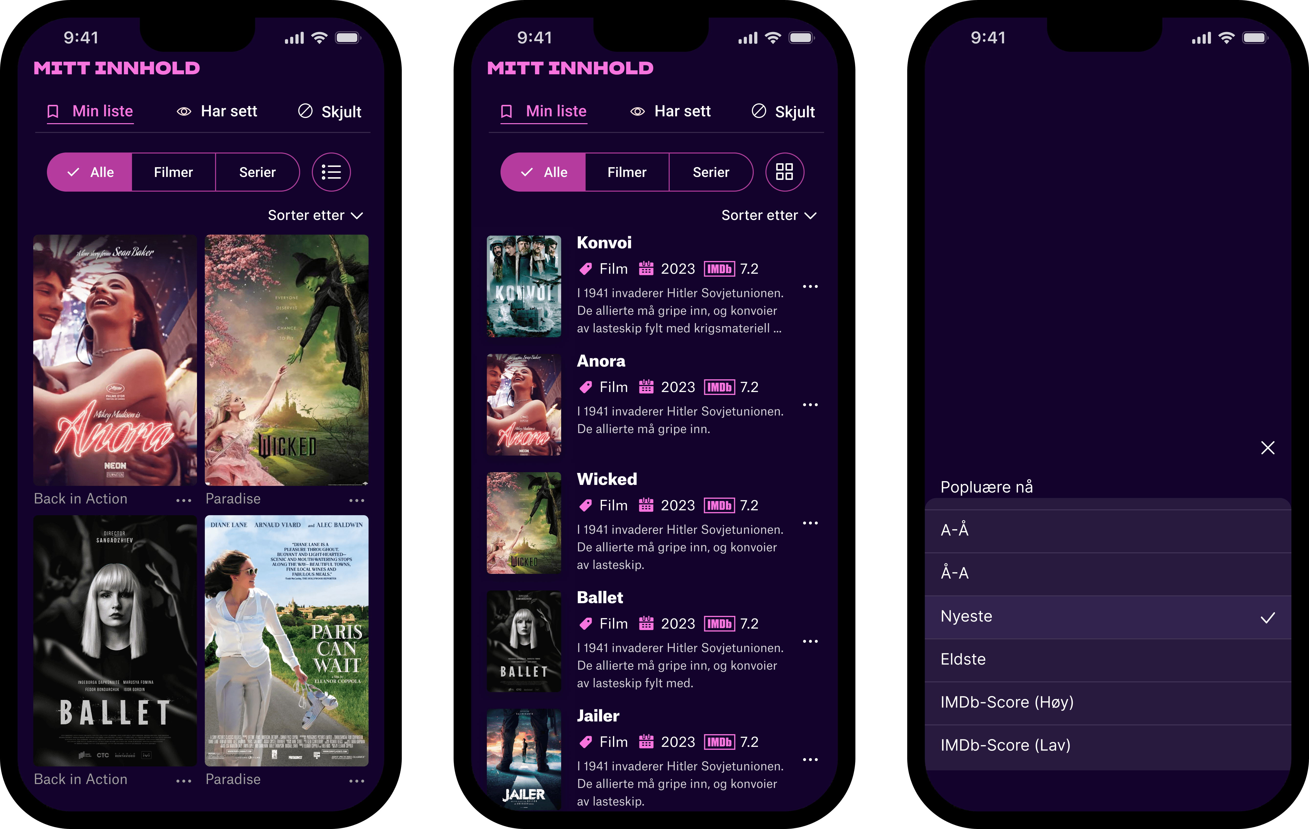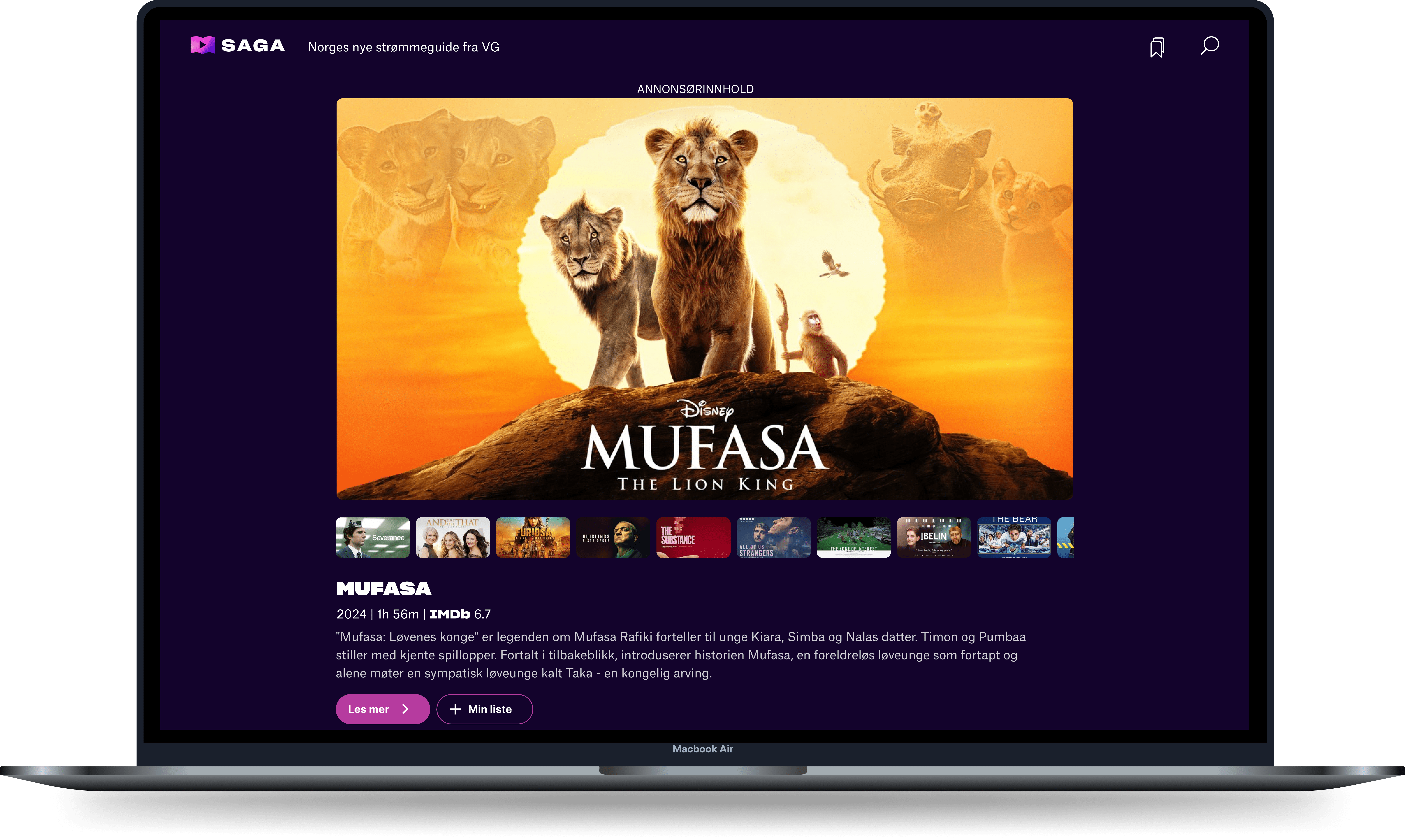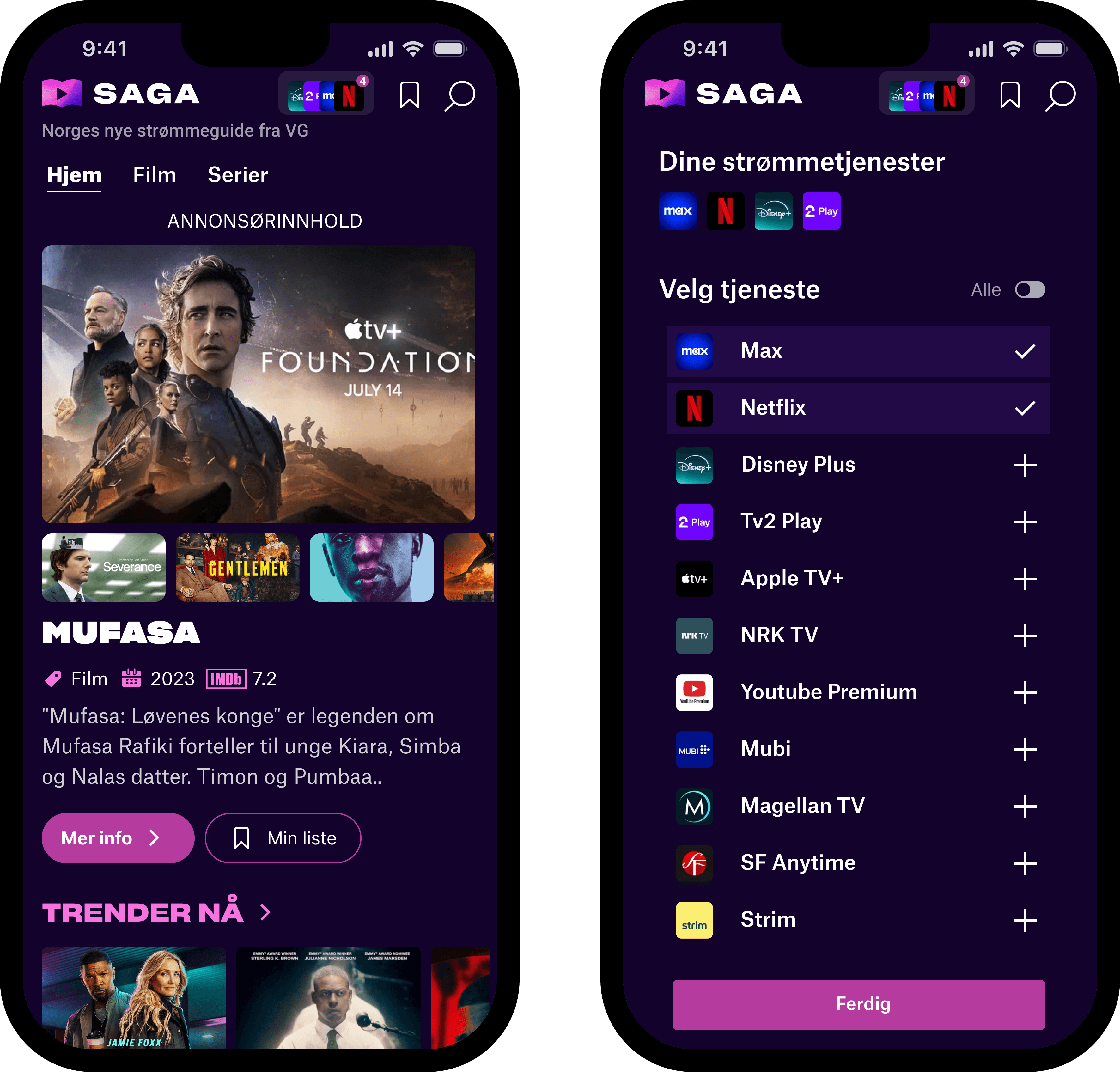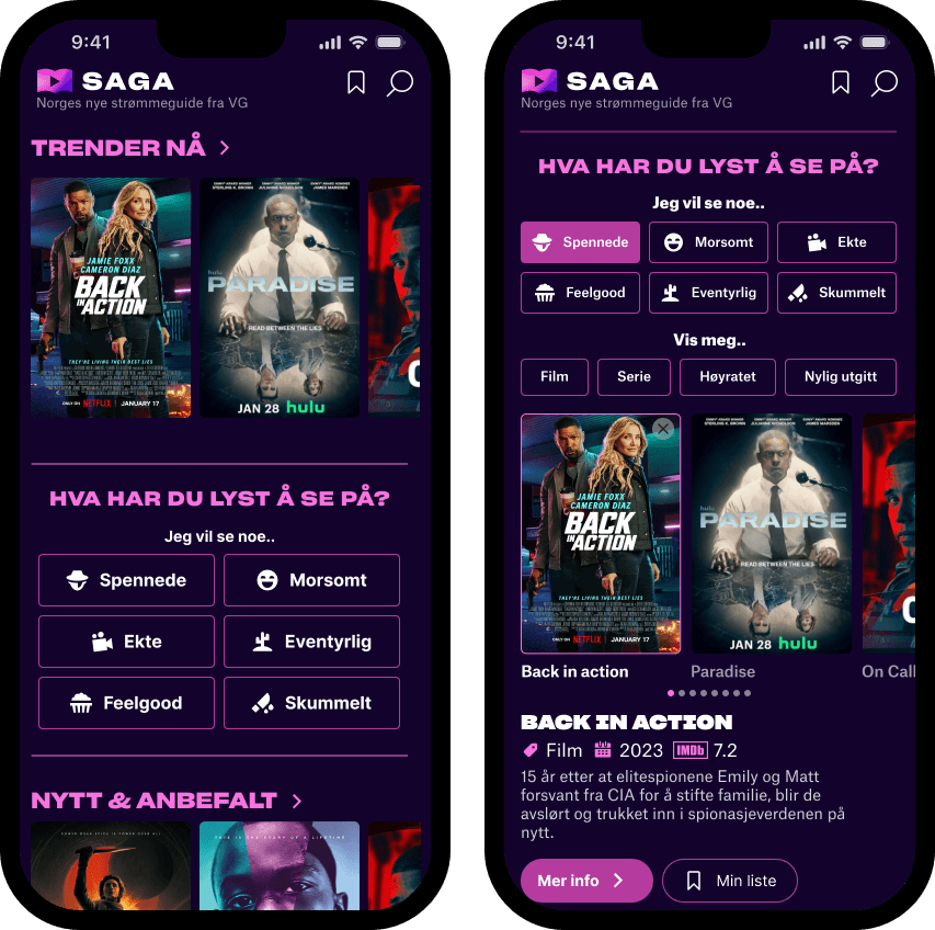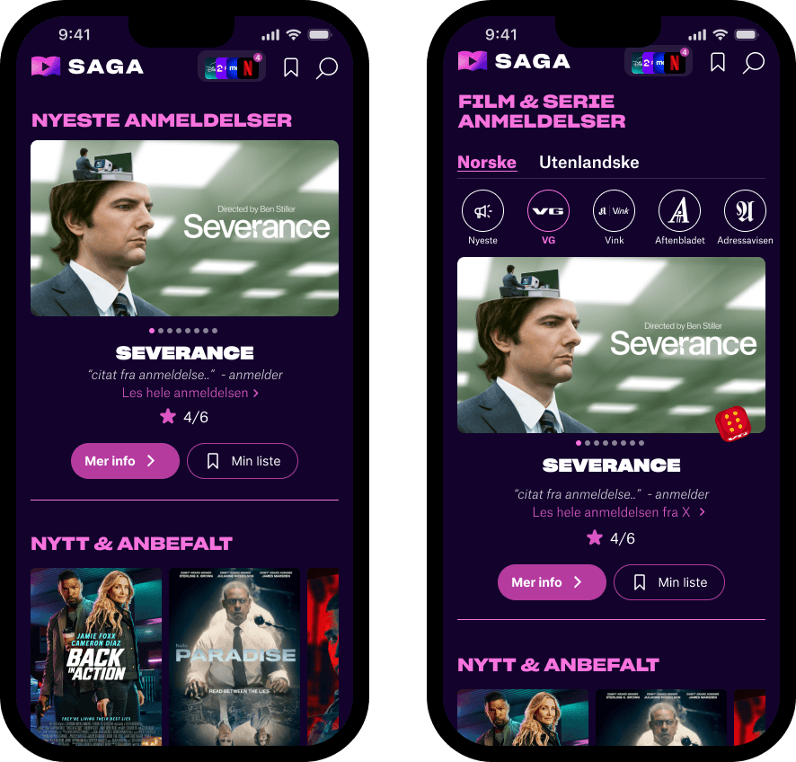 Prosjektet resulterte i en ny versjon av Saga med økt personalisering, bedre navigasjon og mer engasjerende innholdspresentasjon. Vi utviklet og testet komponenter som Jukebox, forbedret søkefunksjon, Mitt innhold og film- og serieanmeldelser, samt designet forslag for navigasjonsmeny, valg av strømmetjenester og topplister. Brukertesting viste at løsningen oppleves som mer intuitiv og inspirerende, og gir målgruppen større kontroll og enklere tilgang til relevant innhold.
